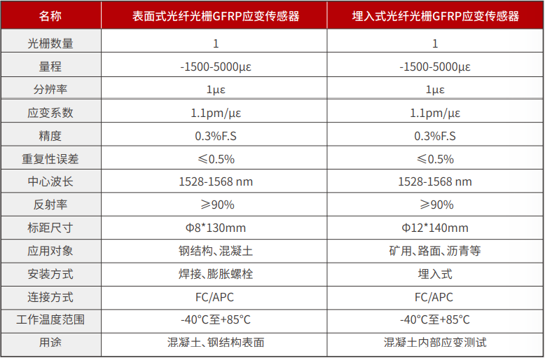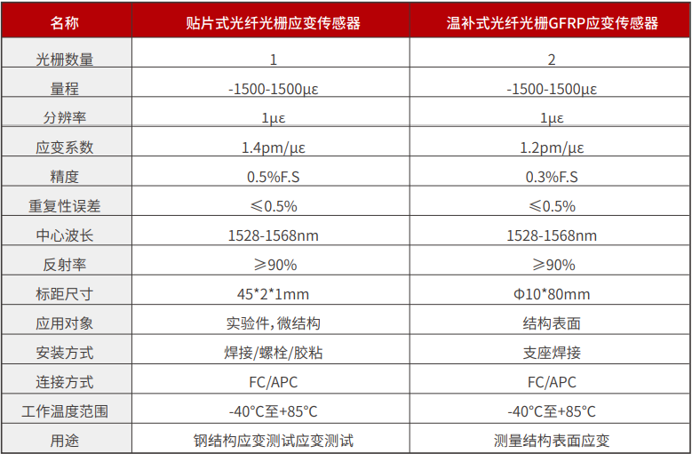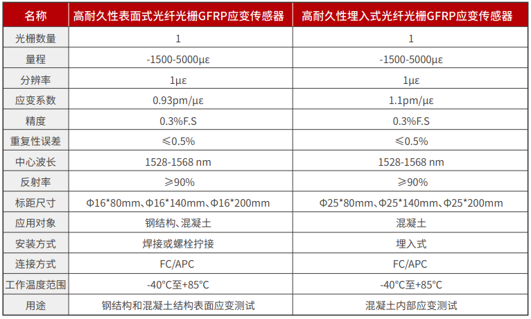 表面式光(guāng)纖光(guāng)栅GFRP應變傳感器(qì)(JF-FBG-S01C)、埋入式光(guāng)纖光(guāng)栅GFRP應變傳感器(qì)(JF-FBG-≠S01D)采用(yòng)無膠封裝技(jì)術(shù),克服了(le)傳統膠封光(guāng)纖光(guāng)栅傳感器(qì)不(bù)可(kě)π跨越的(de)耐久性問(wèn)題,可(kě)根據工(gōng)程要(yào)求定制(zhì)标距,最小(xiǎo)可(kě)達1-2cm,具有(yǒu)工(gōng)程>布設簡單、量程大(dà)、耐久性好(hǎo)、精度高(gāo)等突出優點。