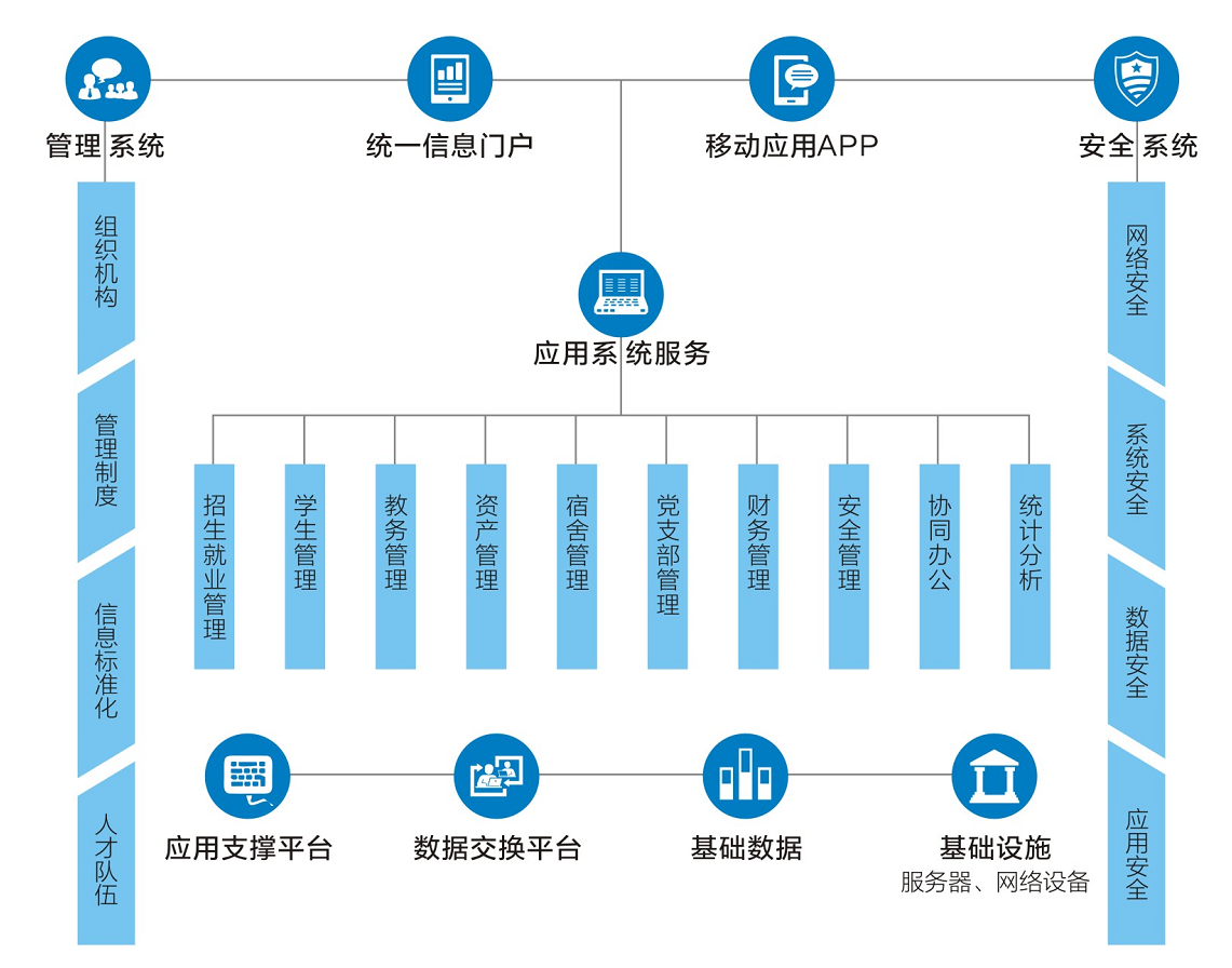 以精細化(huà)管理(lǐ)理(lǐ)念為(wèi)指導,以“互聯網+”的(de)思維方式和(hé)大(dà)數★(shù)據、雲計(jì)算(suàn)等新一(yī)代信息技(jì)術(shù)打造智能(néng)、高(gāo)效的(de)綜合信息管理(lǐ)平台↕。綜合信息管理(lǐ)平台以精準化(huà)服務為(wèi)特色,以開(kāi)放(fàng)性、先進性、可(kě)擴展性、安全性、易用(yòn©g)性和(hé)标準性為(wèi)設計(jì)原則。通(tōng)過統一(yī)信息數(shù)據标準、統一(yī)信息門(mén)戶平台、統一Ω(yī)身(shēn)份認證平台、公共數(shù)據交換平台、協同辦公服務系統和(hé)部門(mén)業(yè)務支撐系統,實現(xiàn)學校(xiào)綜合管理(lǐ)過程可(kě)量 化(huà)、教育決策科(kē)學化(huà)、教育模式個(gè)性化(huà)、教育管理(lǐ)可(kě)視(shì)化(huà)和(hé)教育評價的(de)綜合化(huà)。